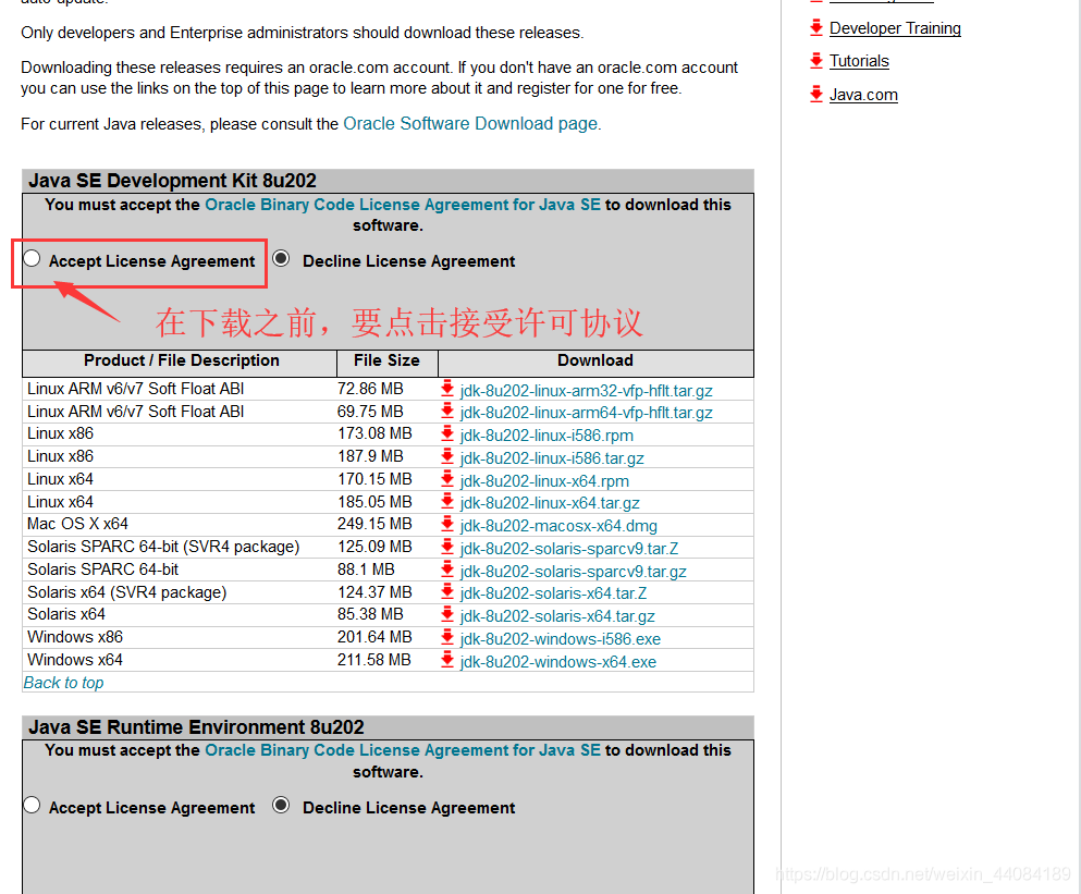 8.进入JDK1.8的下载页面,可以看到适用于多种操作系统环境的JDK。在下载之前需要点击Accept License Agreement(接受许可协议)。