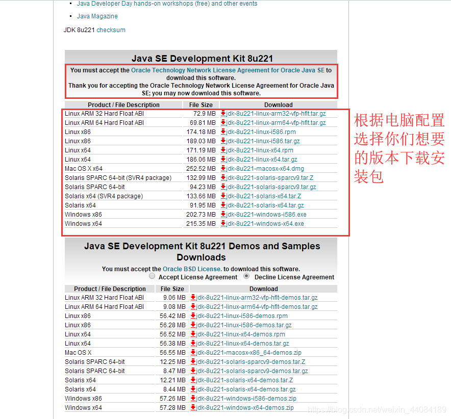 9.根据电脑配置选择你们想要的版本下载安装包,如:64位的Windows系统就点击jdk-8u221-windows-x64.exe进行下载。