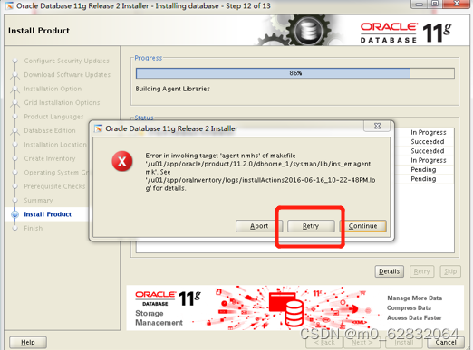 执行完成。 /runInstaller之后,在安装图形界面时,出现“Error invoking target ‘agent nmhs’ of makefile”,解决办法如下: 在makefile中添加一个链接到libnnz11库参数