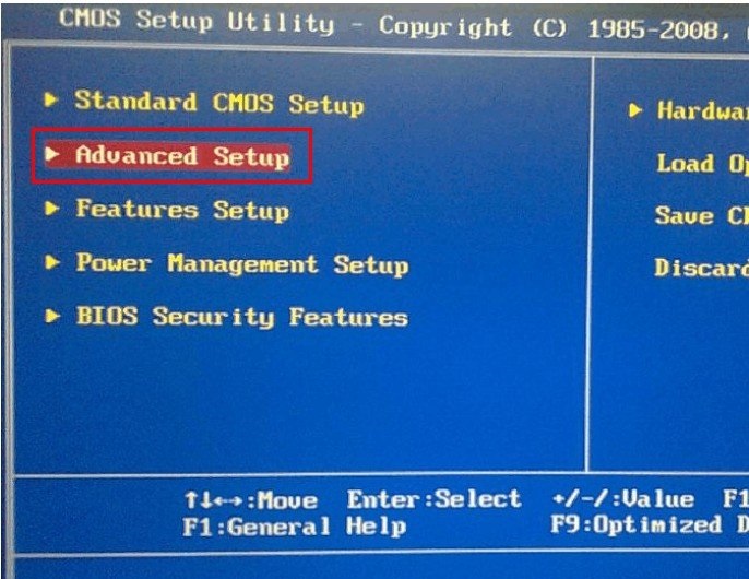 正如上图所示,当进入bios设置界面的时候,我们按上下↑↓方向键将光标移动选择到第二选项“Advanced Setup”处,然后按下回车键“Enter”进入;