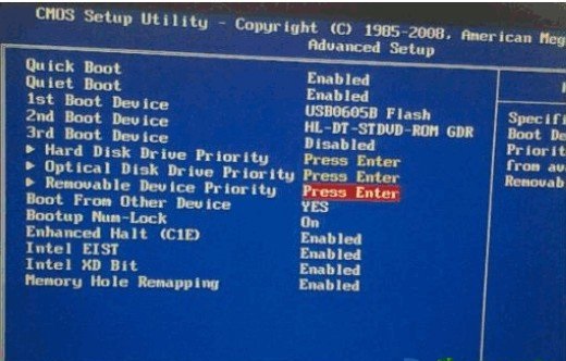 当按下回车键以后,将会进入如下图所示的界面,然后继续选择到“Removable device priorty” --》“press enter” 再按回车键!!