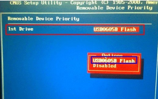 正如上图所示,“1st Drive”按回车键打开后,会弹出一个选项,我们选择“USB...Flash”(此为识别到的u盘的名称,每个u盘可能识别到的名称不一样,我们只需记住有关于USB的,或则您的u盘品牌名的就是了!),此时我们选择完以后按下回车键确认!