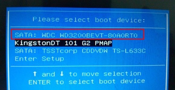 开启电脑后当看到开机画面的时候,连续按下键盘上的"Esc"键,当我们连续按下快捷键Esc以后将会进入到一个启动项顺序选择的窗口!进入后的光标默认选择的选项将会是第一个“电脑本地系统引导”,可能有些人的默认第一个选项是电脑本地硬盘!如下图所示的:(下图中红色方框的选项就是光标默认的第一个选项,小编已将光标移至第二个选项,所以在下图中的光标就已显示在第二个选项中了)