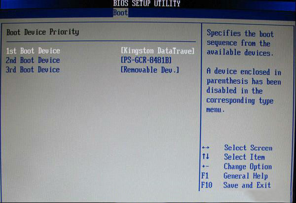 如果在图1-2的硬盘驱动器“Hard Disk Drives”里面没有将U盘作为第一启动设备,那么,在这里就不会存在和显示U盘,如上图2-2所示。但是,我们可以选择移动设备“Removable Dev.”来作为第一启动设备;