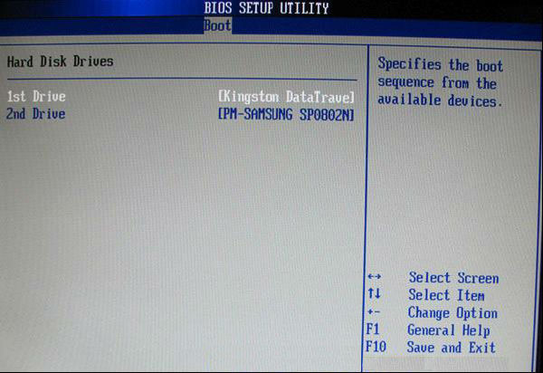 上图3-2 进入硬盘驱动器“Hard Disk Drives”界面,需要选择U盘作为第一启动设备“1st Drive”。如果之前在“Hard Disk Drives”里已经选择U盘为第一启动设备,如图3-2所示,那么在这个界面里就会显示有U盘,我们就可以选择U盘作为第一启动设备,如图4-2所示。