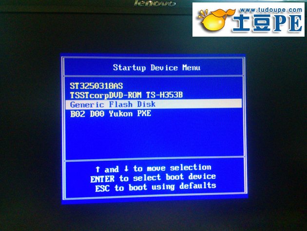 大家看下图,将光标移动选择到的地方显示“Gener ic Flash Disk”(土豆PE小编写这篇教程的时候使用的是u盘)所以,当我们按下快速热键F12的时候显示出来的选项中就包含有小编用土豆PE制作好启动盘的u盘。
