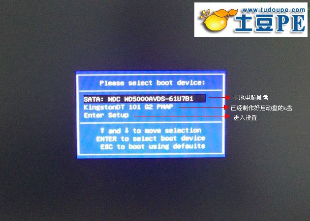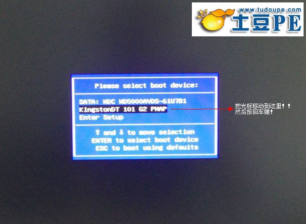接下来我们要做的就是:按键盘右边上下方向键(↑ ↓),将光标移动到中间那个选项,也就是我们插入的u盘(已经用土豆PE制作好启动u盘的),如下图所示: