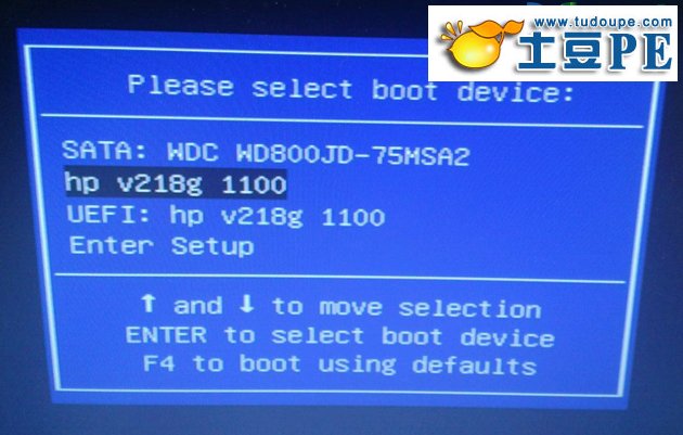 土豆PE温馨提示:如果默认选项不是u盘,那么请将光标移动到标识的u盘处即可!今天小编使用的u盘是惠普品牌的!