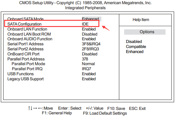 时,按DEL键进入BIOS设置程序,进入找到Integrated Peripherals中的SATA Configuration 并设置为IDE