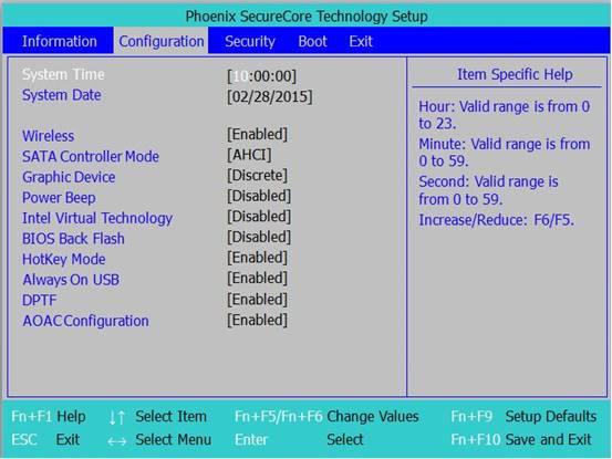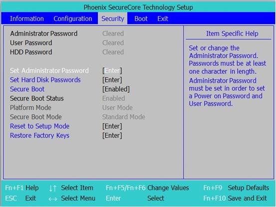 Security Boot:开启或关闭安全启动(在将预装Winodws 10/8.1/8系统改装Windows 7时,请关闭此功能)