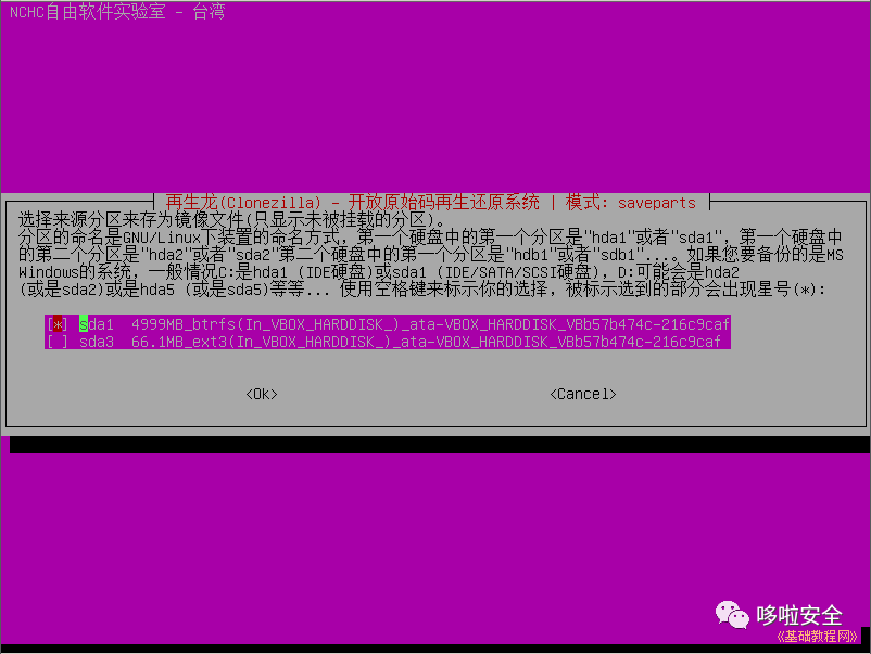 (5) 然后选择要备份的分区, 通常选择第一个系统分区, 第一个 sda1, 第一个 sda1, 在前面用星号标出空间按钮, 返回按钮继续 ;