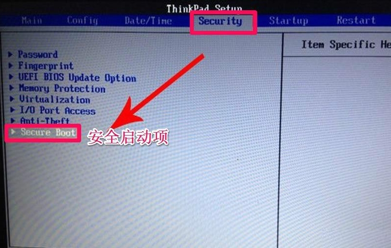 2. 进入BIOS系统后,前往“安全”查询“安全靴”,然后按 Enter 键访问分项目。