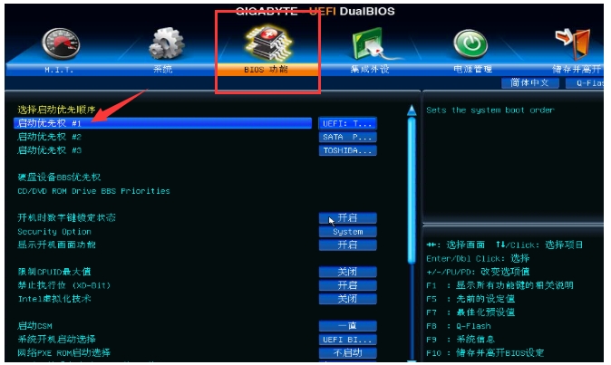 3。输入菜单,然后使用左右箭头按钮移动到 BIOS 功能选项,然后选择“ 启动优先级 # 1 ” 并再次按下输入键。输入菜单,然后使用左右箭头按钮移动到 BIOS 功能选项,然后选择“ 启动优先级 # 1 并再次按下输入键 。