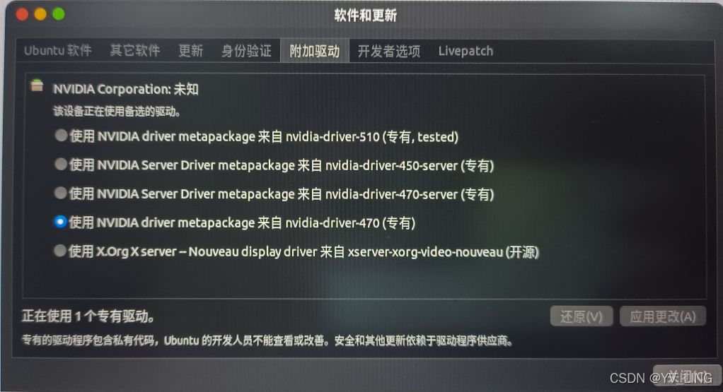 现在很多笔记本都是双显卡,但在ubuntu系统下很容易出现显卡驱动未正确安装,只能使用核显导致性能下降,甚至出现花屏、崩溃等问题。我的笔记本使用英特尔核显和英伟达1650Ti独显。在启动器中找到“附加驱动”,单击打开。建议选择最新版本进行安装,我这里最新版本为510,但在安装过程中出现报错,存在依赖问题,所以我选择470版本,点击应用更改,输入密码验证即可。安装完成后重启,完成更改。