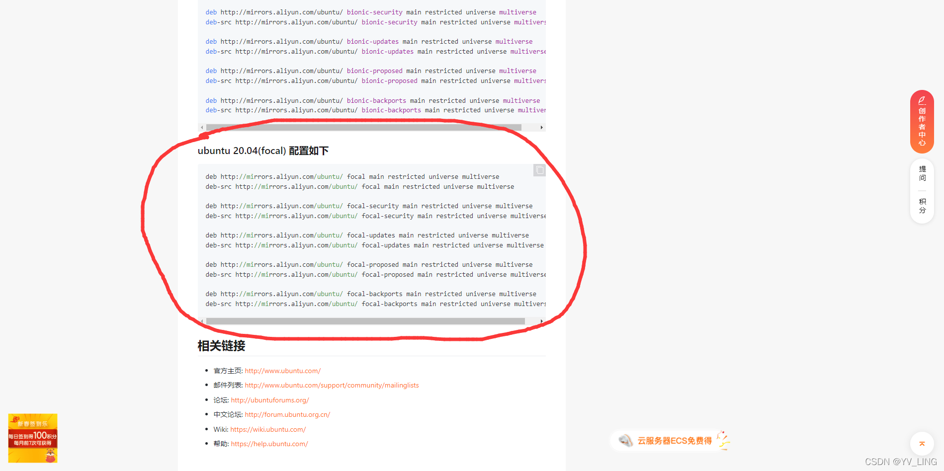 下滑找到ubuntu 20.04(focal)的源地址(ubuntu20.04版本的关键字为focal,与其余版本区分)