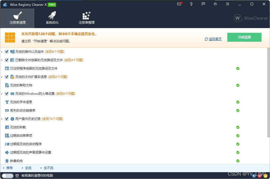 打开Wise Registry Cleaner,选择深度扫描,勾选所有项,点击开始清理。