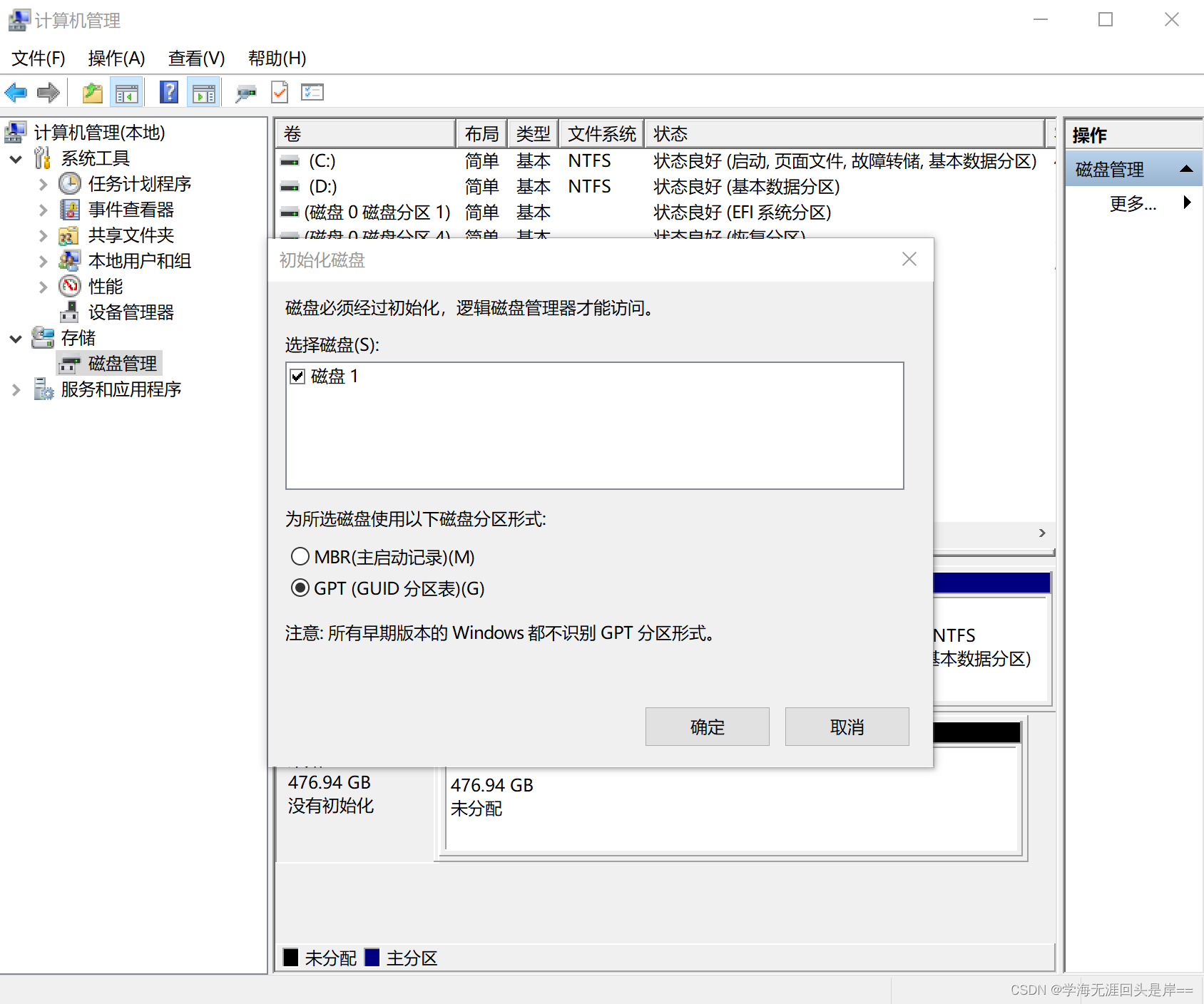 step2:“此电脑”-->右键选择"管理",查看固态分区情况,发现除了EFGH四个分区还有EFI系统分区和恢复分区,对于EFGH分区,逐个选中分区右键删除即可,对于EFI系统分区和恢复分区不能直接删除。