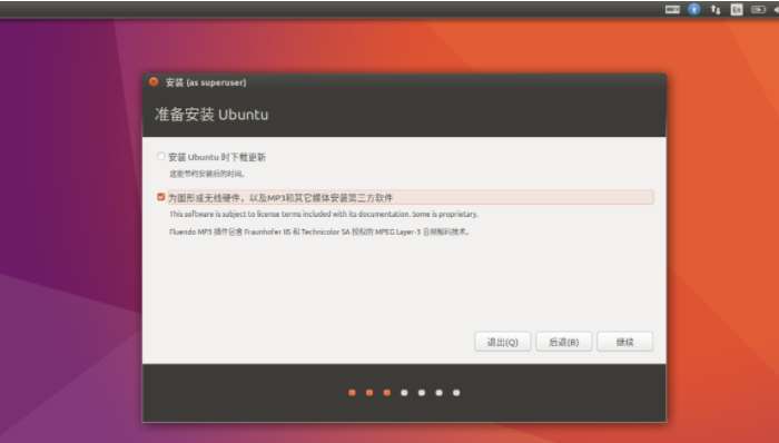 4、点击"安装Ubuntu",出现以下或类似界面只选"为图形或无线硬件,以及MP3和其他媒体安装第三方软件",不选第一个,边安装边下载更新很慢,点击"继续"。