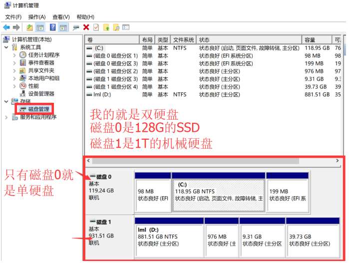 2、搞清楚电脑的硬盘数。打开"此电脑"点击右键,点击"管理",点击"磁盘管理":
