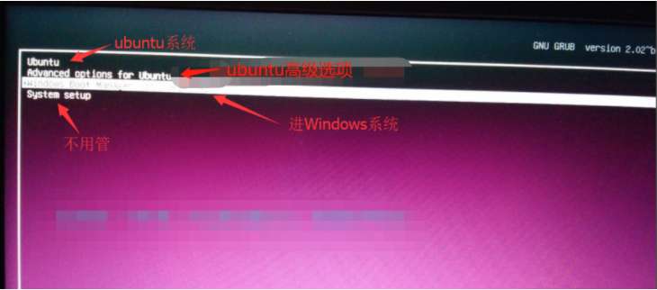 12、重启后你会看到以下界面,第一项是ubuntu启动项,第二项是ubuntu高级设置,第三项是windows启动项,第四项不用管,默认选择的是第一个,回车进ubuntu系统即可使用。