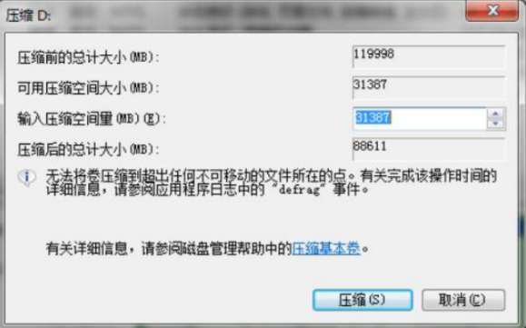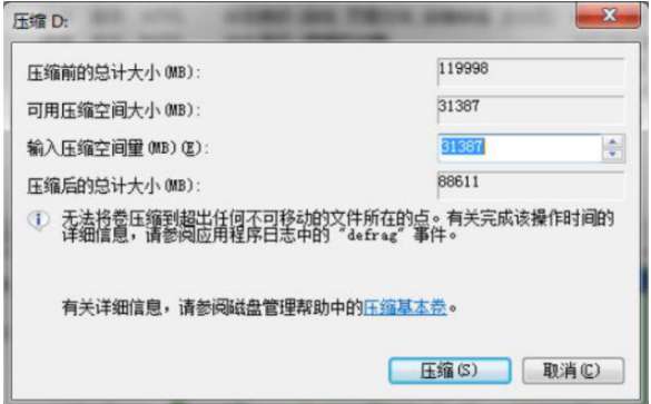(1)如果是单硬盘,选择最后一个盘(比如 CD两个盘的最后一个是D盘,CDE盘的最后一个是E盘,CDEF盘的最后一个是F盘,以此类推),在该盘点击右键,选择压缩卷,如下,输入压缩空间量,单位为M,如果空间充足,建议分出80G或100G,空间不足也可以分60G(1G=1024M)。