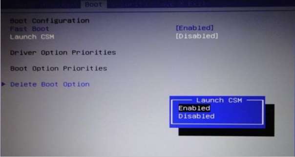 3、接着再使用方向键移至“Boot”选项卡,选择“Launch CSM”回车,改成Enabled。然后按f10键保存设置退出,电脑自动重启;