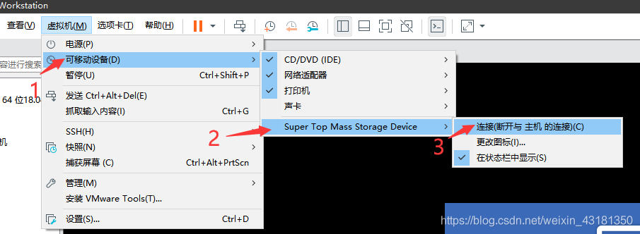 2.启动之后,先让U盘连接到虚拟机,在菜单栏“虚拟机”>“可移动设备”>最下面你的U盘>“连接”,弹出的窗口都点“确定”即可,依此再次查看U盘前面打了勾说明连接上了。