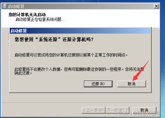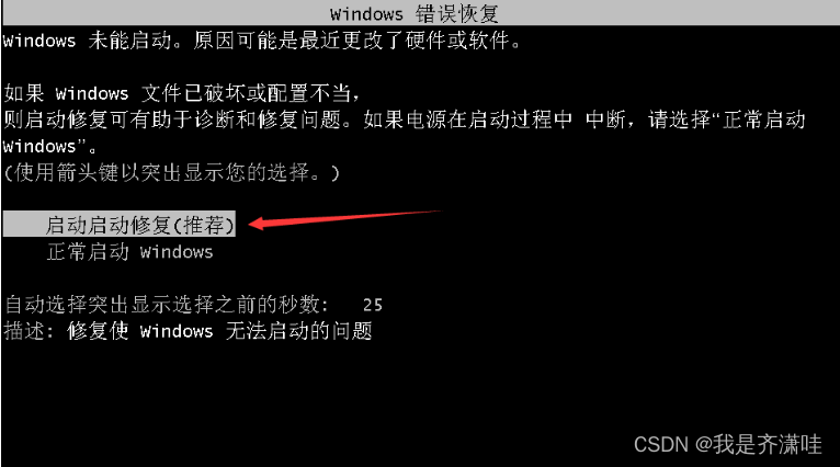 1.开机时强制断电,再次打开有修复页面出现,启动修复。