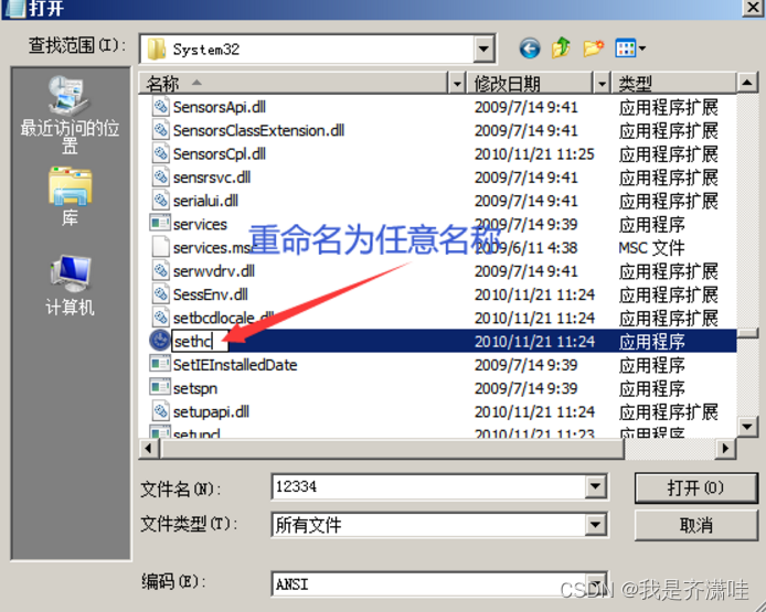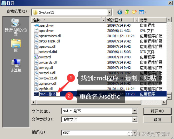 5.找到sethc,重命名其他名字。cmd复制、粘贴、重命名为sethc
