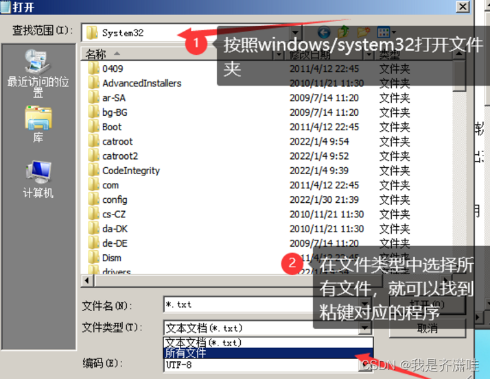 4.可以打开计算机的内容,在系统盘里找system32,在文件类型中选择”所有文件“