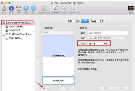 1.首先我们在mac的页面中,点击实用工具里的磁盘工具,然后选择整个硬盘,点击“分区”,通过“+”号增加windows盘的大小,点击应用。