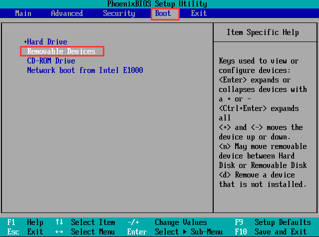 第三步:使用“+”键调整选项“Removable Devices”至第一的位置,然后按“F10”在弹出来的弹框中选择“YES”保存退出即可