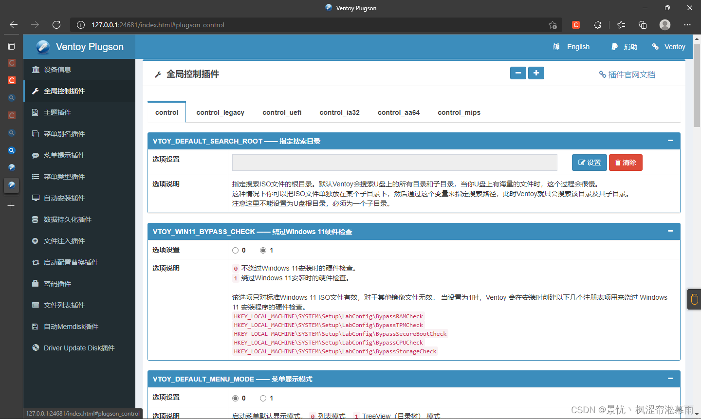 最新的安装包中有VentoyPlugson程序,检测到安装好的U盘后点击启动可以在浏览器中对U盘进行设置,每修改一个设置都会自动保存(目前的版本支持绕过win11的硬件检测安装win11系统)