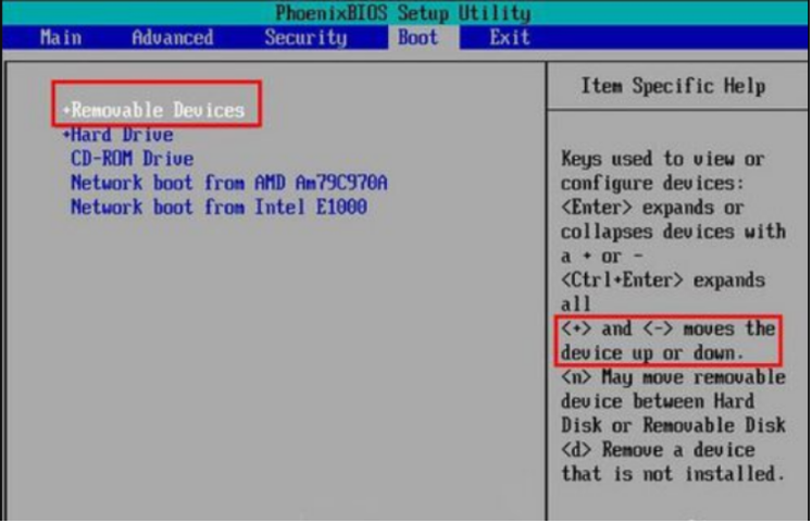 2. 将“可移动设备”移动到列表的顶部,使驱动器能够启动,然后按“+”键向上移动。