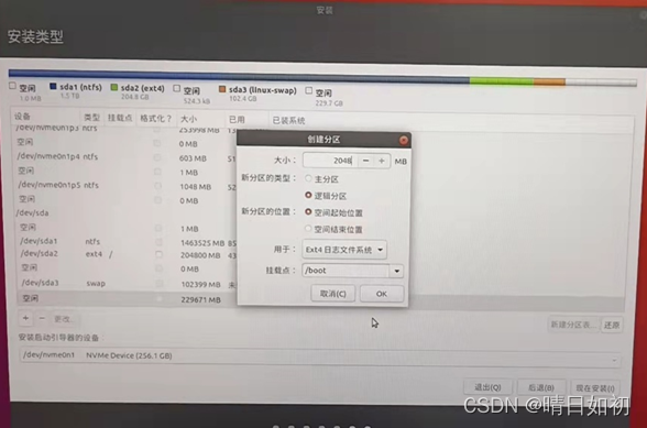(3)/启动逻辑分区 大小 2G (500M1G)( 上点 : EXT4 日志文件系统, 启动牵头项目, 存储系统启动文件) (逻辑分区, 空间启动位置)