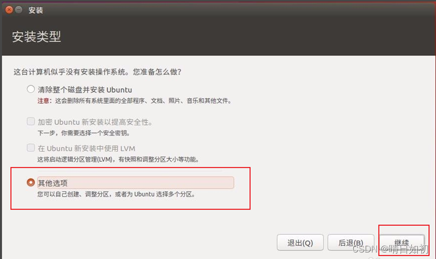 2.3 安装类型:要继续,请选择 " 其他选择 ",然后单击 " 继续 " 。