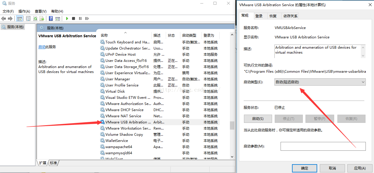 如果没有迹象表明该设备应当移动,在大多数情况下,VMware Usb服务没有启动。输入命令服务. msc 以打开服务管理器 。发现了VMware USB 仲裁,并按下了适当的按钮。同时右键选择属性,应使用启动模式而不是启动模式。