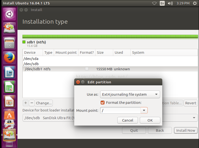双击 dev/ sdb/ ntfs, 然后选择使用 etx4, 检查格式, 然后将数字点设置为 / 。