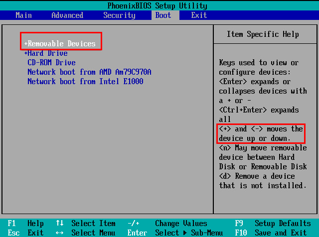 3、查看说明,按+键要继续,我们必须将“可移动措施”改为顶部,以便从闪存驱动器开始,如下图所示: