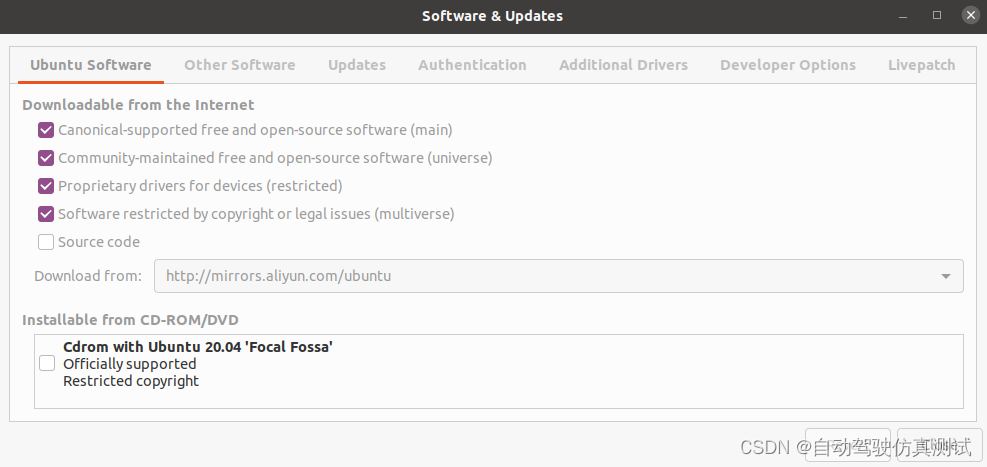 系统默认安装源缓慢 。点击桌面左下角,选择“Software & updates”,Ubuntu Ubuntu 软件页面上单击在下载的“ 其它” 部分中选择本地来源 。阿利云是我的选择