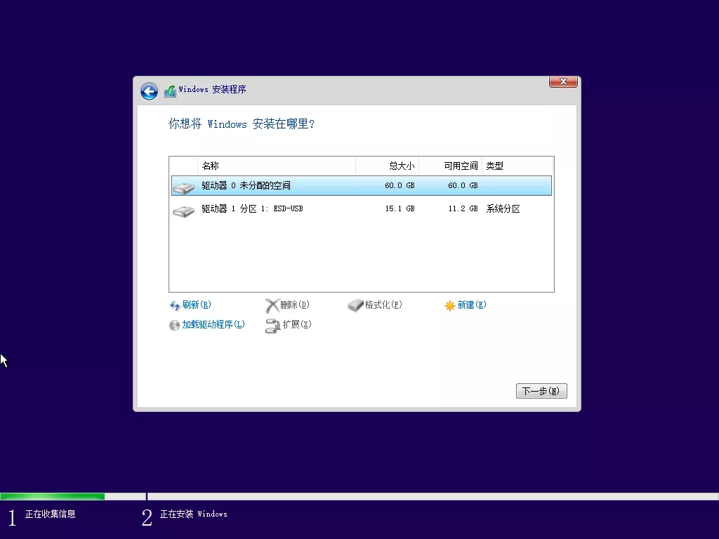 在典型情况下,如果系统磁盘目前没有格式化,则格式化系统磁盘(其他磁盘没有格式化),并选择默认地在原系统磁盘上安装 Windows;如果没有经验,则不要轻易修改其他分区的设置。