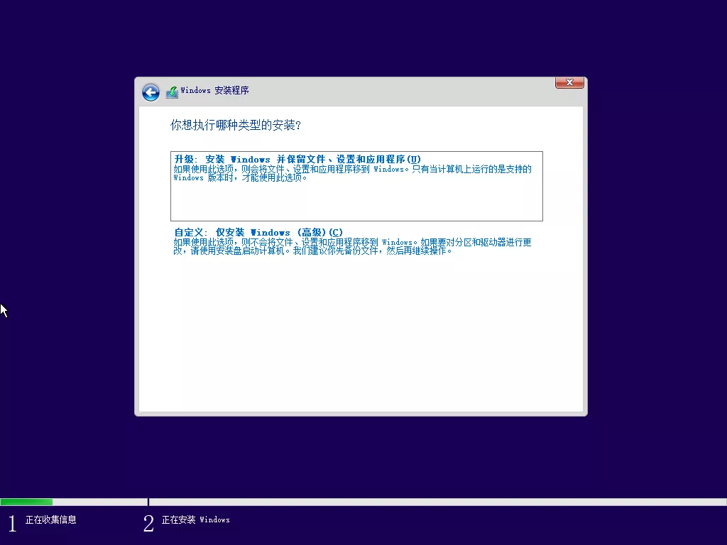 选择“ 您想要执行哪种安装” 句中自定义 : 只安装 Windows( 高级) 。