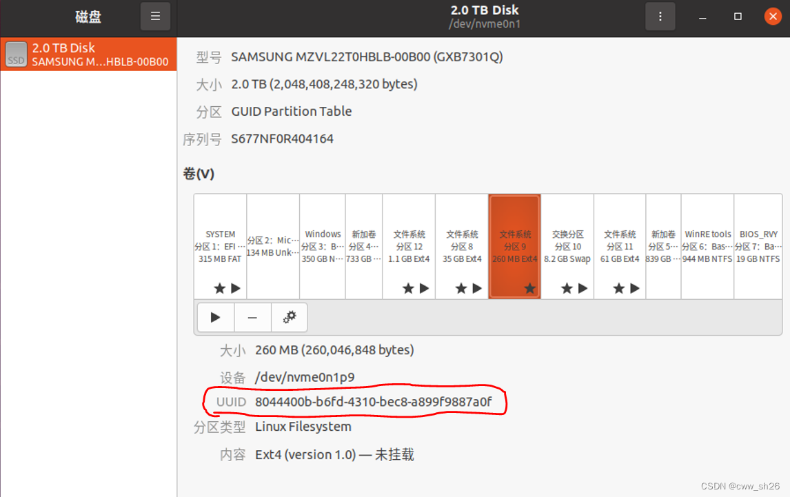 a.在Ubuntu系统上,使用磁盘工具查看新/旧/启动分离的UUID: