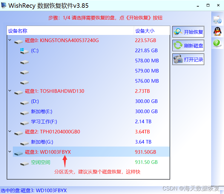 步骤1:下载和卸载软件后,双击需要恢复的分区。