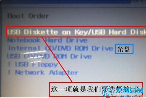 6、再选择USB Diskette on Key/USB Hard Disk这一项,其中文意思是“USB硬盘或USB电脑硬盘”,按Enter键确定。