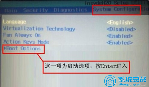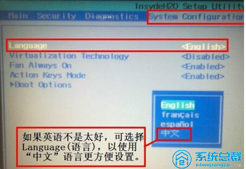 3、进到BIOS主界面后,选择System Configuration“系统配备”,假如是英文不太好的好朋友,可以直接选择Language(语言)此项,按Enter进到。