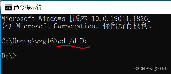 2. 使用cd 命令,"cd"与要进入的盘符之间添加“/d”,再加上冒号":",如下:
