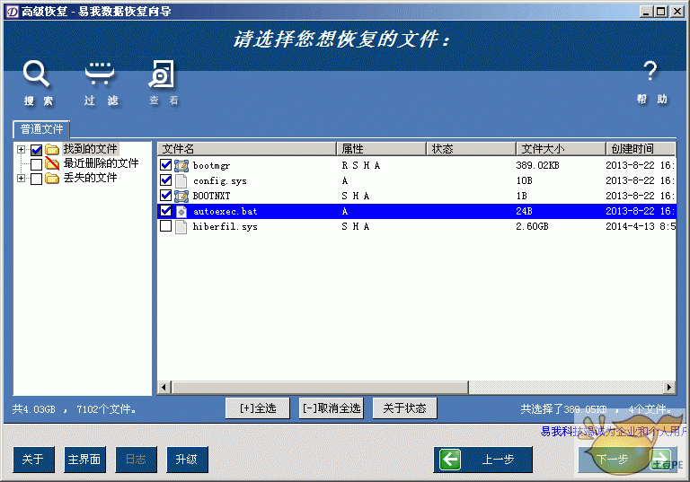 工具会自动开始搜索被删除的所有文件,我们只需耐心的等待,直到搜索完成后我们便可以看到列在右边的文件,选择需要恢复的文件并点击“下一步”按钮即可。如下图所示: