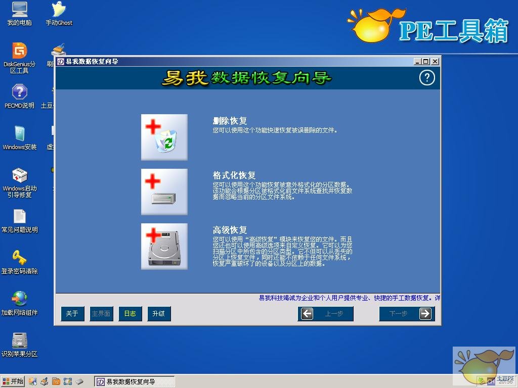 在土豆PE的主菜单界面上将光标移至“运行土豆PE win2003PE增强版(老机器)”后按下回车键确认,等待进入winPE系统后,依次点击开始—程序—数据恢复—易我数据恢复即可;如下图所示: