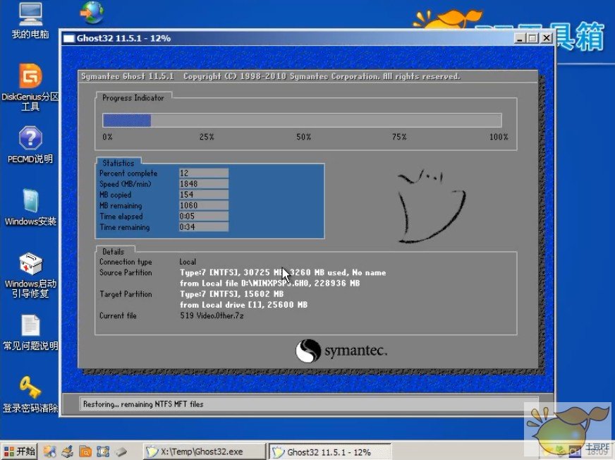 4、在TDGHOST对话窗口,点击“是”,就会自动镜像安装XP系统,大概3分钟左右就会安装完XP系统,就会自己重启,在重启时,记得将U盘拔掉。